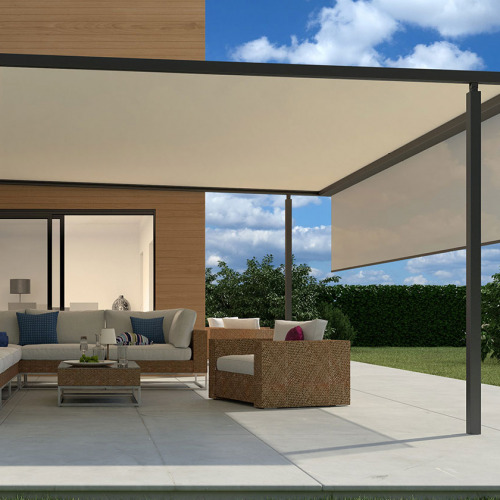 Eine raffinierte Mischung aus ausfahrbarem Sonnenschutz und einer feststehenden Pergola. Mit ihren Stützen, die die Schienen für den Markisenstoff tragen, vereint sie somit die Flexibilität einer Markise bei gleichzeitiger Stabilität einer im Boden verankerten Pergola.